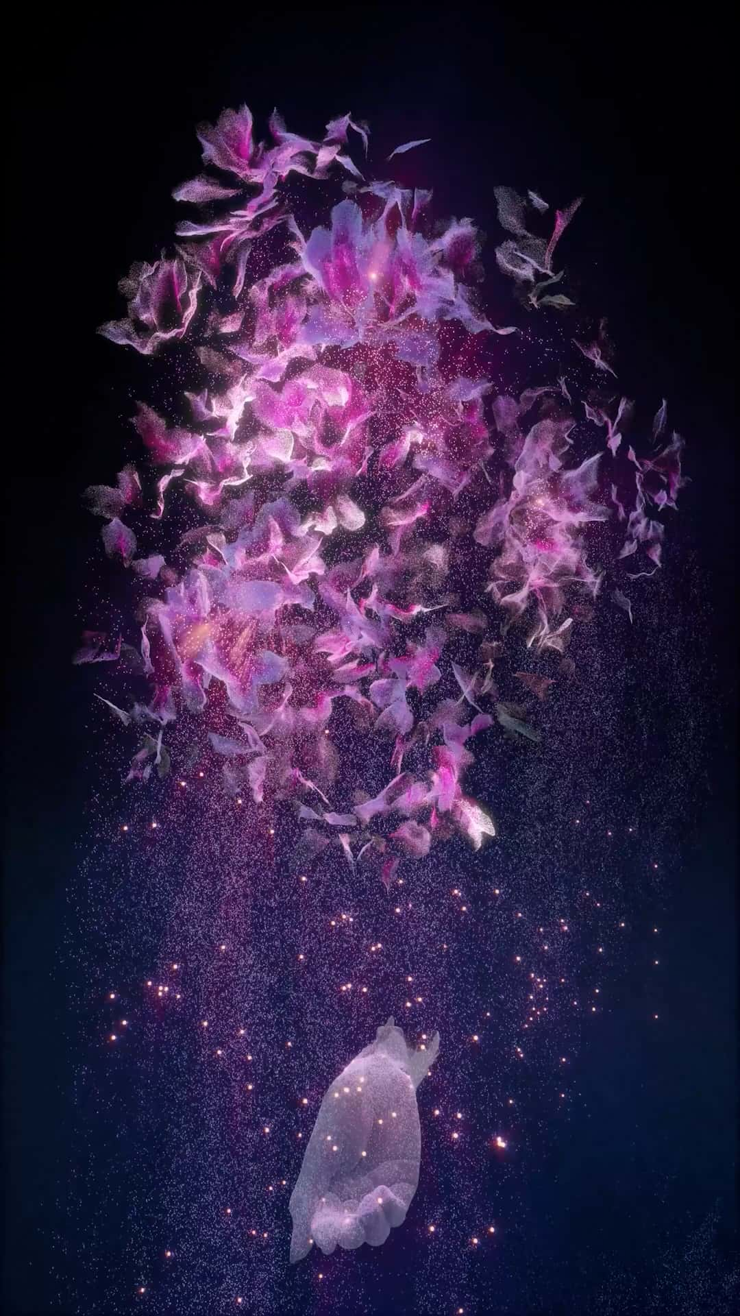 It is comprised of a large scale video installation of a LIDAR scanned Azalea bush, animated to release gentle particles of glowing dust that slowly gather in a 3D scan of my human hand.